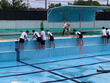 5年生のシンフォニア達は、一心不乱にプールを磨いていました。