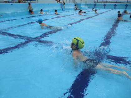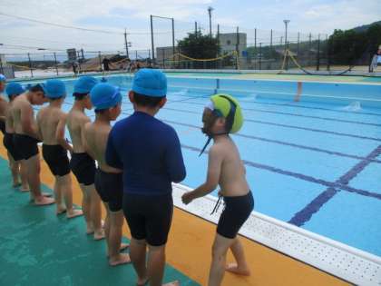 今日から、水泳学習が始まりました。1年生・2年生・たけのこ学級の子どもたちは、低水位にて水慣れ・水遊びをしました。