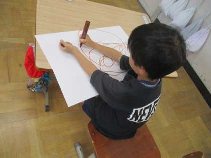 図工科で「せんのぼうけん!」の絵を描きました。マジックで描いた線に沿って、いろいろな街の様子が展開します。大きなみかんの絵を描いた子どもは、「とくだいみかんのあるまち」という題名をつけました。