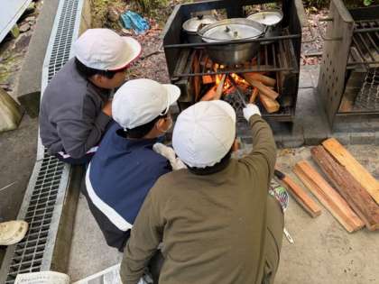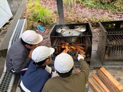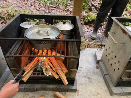 ええ感じに火がつきました。燃える薪をじっと見ています。