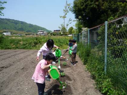 たけのこ学級の畑に野菜の苗を植えました。作ってもらっていた畝に、みんなで穴を掘ってキュウリとナスとトマトの苗を植えて、水をたっぷりあげました。野菜がたくさんできるように、明日から毎日お世話をがんばりたいと思います。
