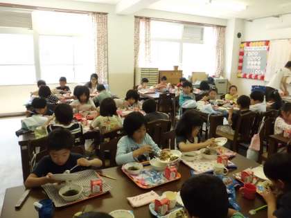 1回目は2年1組です。4時間目に野菜を緑黄色野菜と淡色野菜にわける「やさいのおなか」の学習をしたあと,ランチルームで給食を食べました。