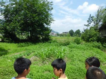 畑では,4年生はポップコーン用のとうもろこしを育てています。