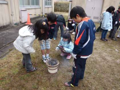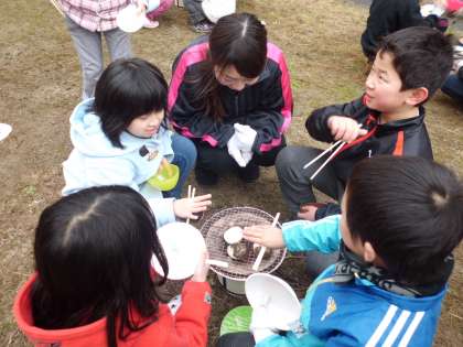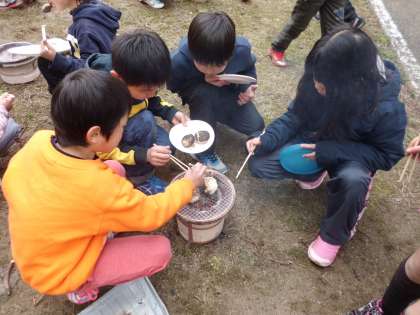総合的な学習の時間『昔のくらしをたいけんしよう』でおもちを焼きました。まずは七輪で火をおこす準備をしました。それぞれの班が協力して七輪に小枝や炭をセットしました。大半の児童が初めての体験でしたが,空気の通り道を防がないように気をつけて,小枝をくべたり,うちわであおいだりしました。「燃えてる!燃えてる!」「あかん!火が消える!」「火をつけるの大変やな」などいろいろな声が聞こえてきました。炭に火がうつったらいよいよおもちの出番です。火力が強くて真っ黒になりそうな班や弱火でじっくり焼く班など様々でしたが,おもちをほおばる顔は笑顔でいっぱいでした。その後,学年園で育てたサツマイモも焼きました。香ばしくて中はほくほくのおいもに大喜びの様子でした。