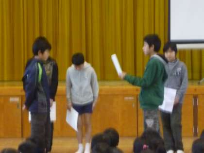 最後に平成26年度の年間平均持参率 上位3クラスを発表し,賞状を手渡しました。
