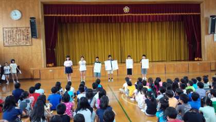 保健委員が夏休みを元気に過ごす方法を「なつやすみ」の折り句で発表しました。保健委員が読んだ後,全校のみんなが後をついて大きな声で読みました。