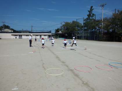 運動会の練習が始まりました。50m走やバラエティー走の練習を行いました。みんな自分のコースをまっすぐ一生懸命走っています。1年生は,初めての運動会です。楽しくがんばっていきたいです。