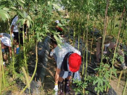 総合的な学習の時間でケナフを育てています。「大原の杜」との交流で夏に畑に植え替えをしたものが2メートル近くになっていました。水やりを夏の間大原の杜の方に等お世話になっていたこともあり,今日は草抜きを4年生ががんばりました。土が乾いていてなかなか抜けなかったところもありましたが,班ごとに場所を決め,順番に抜いていきました。最初は草の量にどうなるかと心配しましたが,根気よく抜いていったことで,最後には高く成長したケナフ畑のトンネルをくぐり抜けることができました。