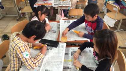 学校の畑で獲れたポップコーン用のとうもろこしを使って,1年生やたけのこの1・2年生と一緒にポップコーンを作って食べようと思っています。しっかりつるして乾かしたポップコーン用のとうもろこしの粒をみんなで取って,準備を始めています。おいしいポップコーンができるといいなと思います。