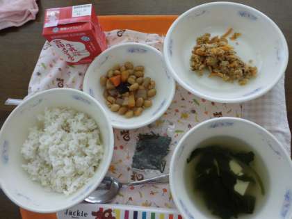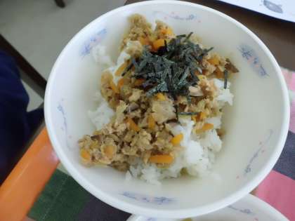 きょうはごはんにのせて食べるツナそぼろ丼の具でした。ごはんにのせたり,混ぜたりする献立は子ども達からも人気です。きょうはきざみのりもかけて,おいしくいただきました。