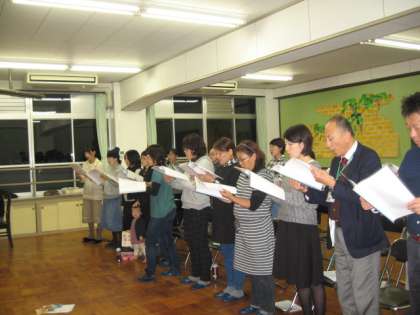 11月22日に行われる「ほほえみコンサート」へ向けて,13日午後7時から夜に特別の練習が行われました。忙しい時間を割いて,たくさんのメンバーの方が集まり熱心に練習を重ねていました。本番へ向けての熱意が伝わってくる練習でした。