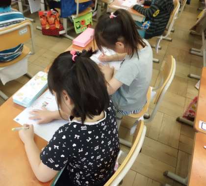 ひらがなの練習をがんばっています。書き順や字の形に気をつけて,ていねいに書くよう一生懸命です。みんな,集中して書いています。