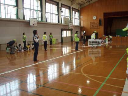 17日(火)3時間目1年生の交通安全教室がありました。大原野交通安全推進会・西京警察署・西京区街づくり推進課・PTA などたくさんの方に準備・お手伝いいただき道路の歩き方について学習しました。体育館の床にテープを張り歩道や横断歩道に見立て,安全を確認しながら歩きました。雨が降った時の正しい傘のさしかたなども教えていただきました。