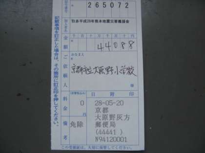 5日間で,計44088円集まりました。日本赤十字社「平成28年熊本地震災害義援金」へ振り込み,熊本県へ送らせていただきました。数多くの皆様のご協力をいただき,ありがとうございました。