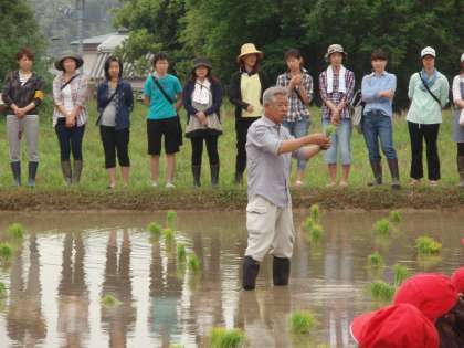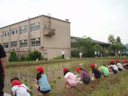 雨が降るかととても心配しましたが,予定通り田植えをしました。米作りをお世話いただいている,地域の仲谷さん・小原さん・上松さんにも来ていただき,まず3年生が西側から植えていきました。最初,泥の中に足を入れるのにとても時間のかかった3年生でしたが,最後はとても上手に植えました。