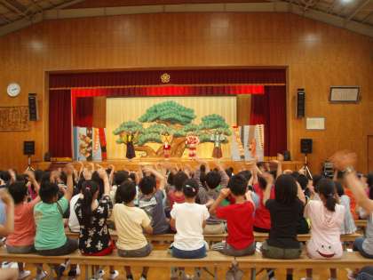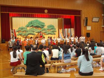 6月7日5・6校時,体育館で文化芸術による子どもの育成事業,狂言ミュージカル「入間川」を観劇しました。今日は5・6年生の代表が大名・饅頭売り・昆布売り・子ども・猿引き・猿の役になって,狂言独特の言い回しでセリフを言ったり,ミュージカルということで,ダンスを全校児童の前で披露したりしました。5・6年生は休み時間は委員会活動などで忙しいのですが,その合間を縫って練習に参加してくれました。5・6年生が盛り上げてくれて、楽しい一時を全校で過ごせました。