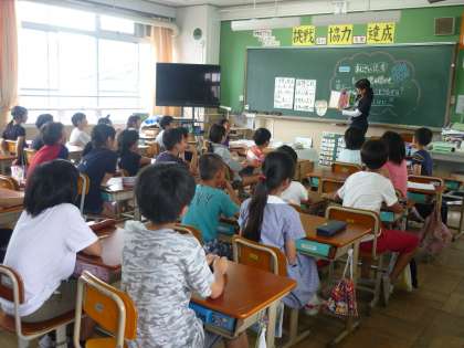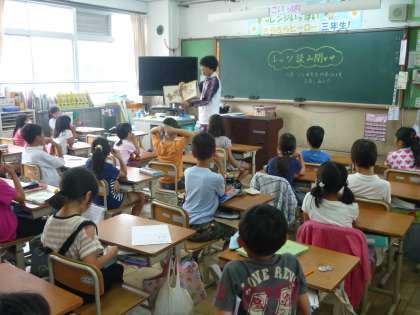 今月は読書月間です。大原野小学校ではあじさい読書月間の取り組みとして,3回(8日,14日,29日)担任ではない教職員から本の読み聞かせをしてもらいます。今日はその第一回です。今日はどんなお話かな?