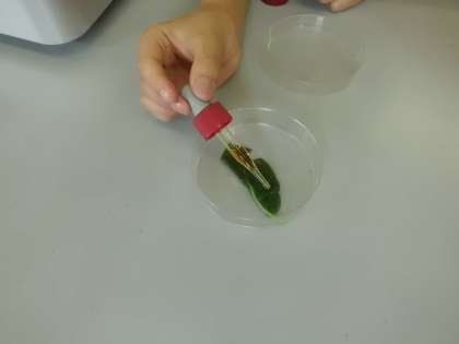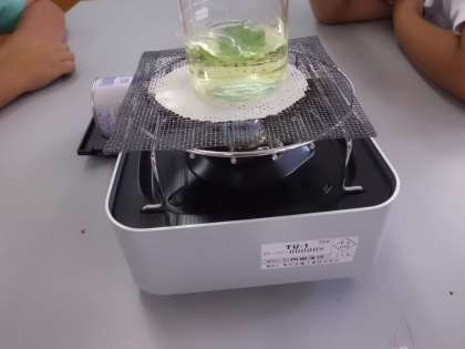 6月9日(木)に理科室でジャガイモの葉に日光を当てるとでんぷんができるかどうかを調べました。日光に当てた葉と日光に当ててない葉で比較実験をしました。じゃがいもの葉の「ヨウ素でんぷん反応」の実験は3回目なので,子どもたちは役割分担をスムーズに行い,実験を安全に進められていました。