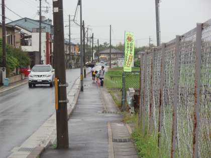梅雨に入り傘をさして登下校する日が多くなりました。写真は6月13日(月)の朝の登校の様子です。傘をさして一列に並んで登校しています。登校班長・副班長さんは,向かい側から歩いてくる人にも注意しています。