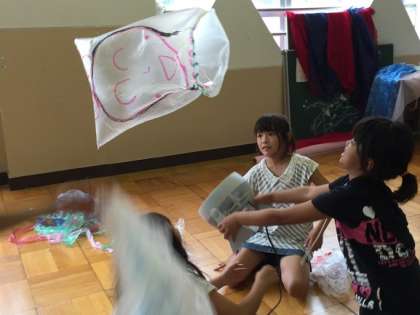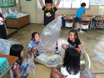 どんな袋がよく飛ぶか,どれくらいの風をあてるとよく飛ぶか,一緒に考えてみて,より飛びそうな物を作ってみました。