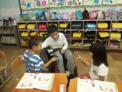 6月28日(火)から,大原野中学の2年生が,チャレンジ体験で1年1組にきてくれました。授業中,子ども達を見てまわりアドバイスしたり,音楽では子ども達といっしょに学習してくれました。中学生のお兄さんが,やさしく教えてくれる姿がすてきでした。子ども達は,中学生のお兄さんとかかわれて,喜んでいました。