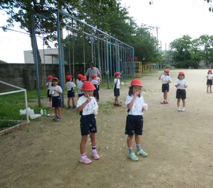 生活の「なつだ,とびだそう」の学習で,しゃぼん玉遊びをしました。どうしたらしゃぼん玉がうまくとぶのか,いろいろ工夫しながらとばしていました。どの子も,いっぱいとばして楽しんでいました。