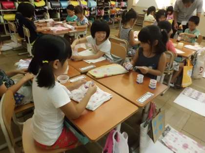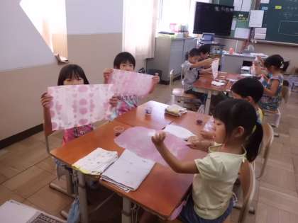 夏休みにあさがおの花を集めて冷凍したものをしぼって色水をつくりました。和紙を折って,色水につけ染めました。和紙をひろげてもようがわかると「できた。」「きれい。」と喜んでいました。