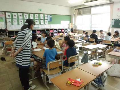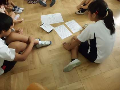 今月より「つながりタイム」は「つながりグループ」で活動します。「つながりグループ」は6年生のリーダーを中心に全校児童を23グループに分けました。今日は初めての顔合せです。自己紹介の後,「つながりタイム」でどんな遊びをするか話し合いました。今日はリーダーや活動する教室を覚えるため,6年生が1年生,5年生が2年生を教室まで送り迎えしました。