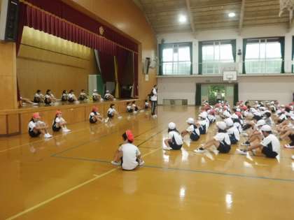 運動会の練習がいよいよ本格的になってきました。1時間目,全校の児童で「全校ダンス」の練習をしました。今年は「キミに100パーセント」という曲に合わせて踊ります。教職員が1度踊ったあと,運動会準備・体操・プラカード係の人が舞台に上がり,細かい動きを教えてくれました。「係りの人も上手だけど,みんなのダンスも上手。これで22日は世界一の運動会になりますね。」とほめていただきました。