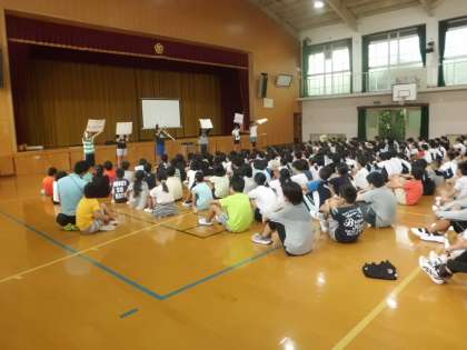 児童会から今月の目標と大原野の5つの決まりを確認しました。また,毎週木曜日アルミ缶集めをしているので,アルミ缶をしっかり洗って持ってきてほしいというお願いがありました。