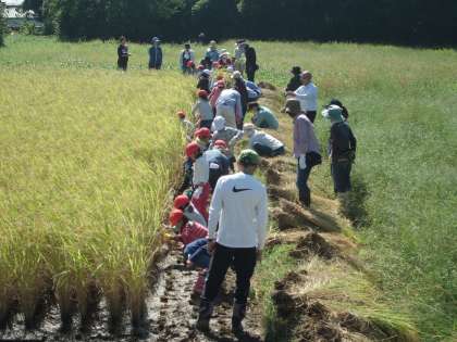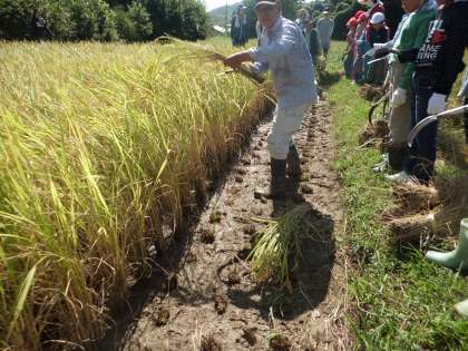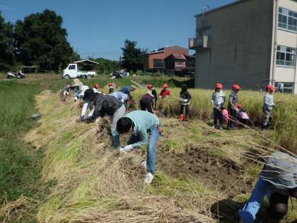 雨で予定変更になっていた稲刈りがやっとできました。地域の仲谷さん・岩崎さん・植松さんに来ていただき,3時間目3年生,4時間目5年生が稲刈りをしました。最近続いた雨で思いのほか田んぼがぬかるんでいました。足が土にとられ苦戦していましたが,刈った稲を7〜8束ずつまとめるようにして刈りました。PTAの方・保護者の方にお世話になり,わらを使い,束ねてもらいました。「いな木」にかけしばらく干しておきます。