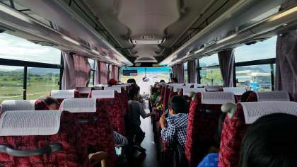 快適なバスの車内で,レクリエーション係を中心にクイズなどをして楽しみました。