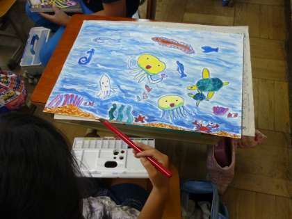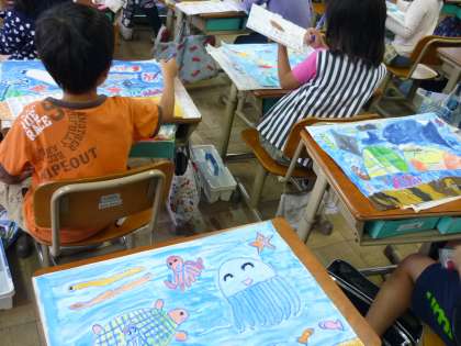 絵本「母恋いくらげ」を題材に,お話の絵を描いています。絵の具の濃淡や色のバランスなどを考えながら,丁寧に仕上げました。2年生になり,絵の具の混色の仕方や筆の使い方も上手になってきました。