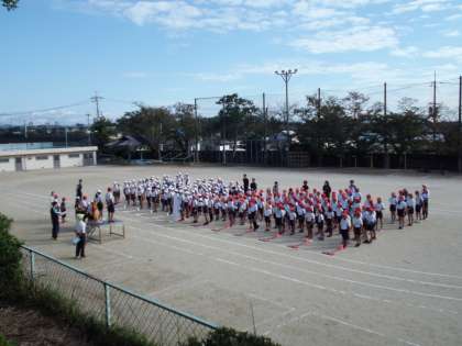 今日は朝から運動場で入退場・開会式・閉会式の練習をしました。