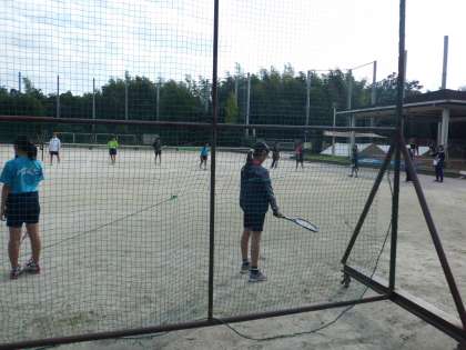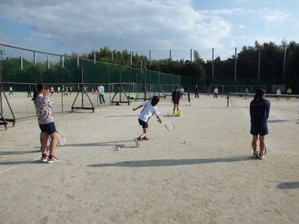 大勢の先輩方に囲まれながら,実際にラケットを使って打ってみました。やさしい声かけもあり,テニスの楽しさを味わいました。