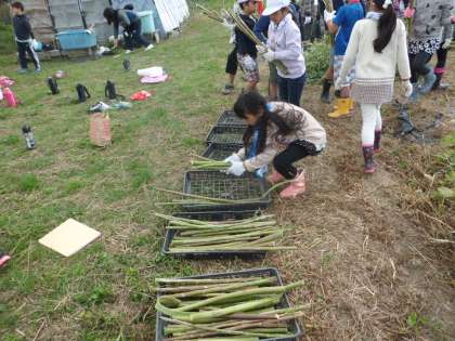 ケナフをのこぎりで切った後は,大人の方に