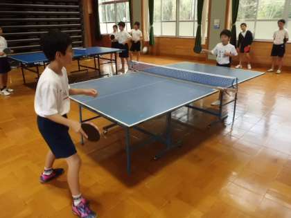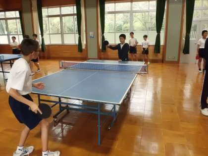 先輩のシャープなラリーを参考にしながら卓球に親しみました。何回もラリーをして,卓球の楽しさを味わいました。