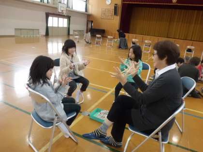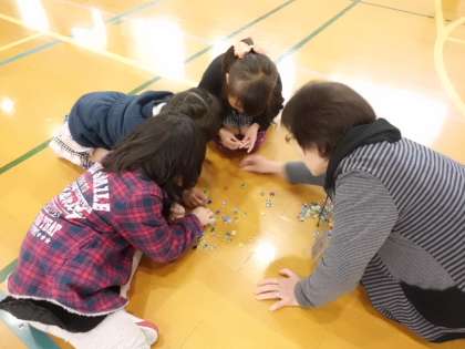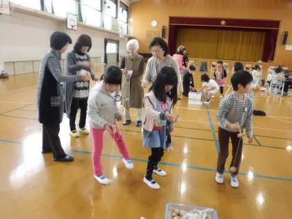 地域の方に,昔の遊びを教えていただく「伝承遊び」を体育館で行いました。坊主めくり・かるた・お手玉・竹返し・めんこ・おはじき・あやとり・折り紙(紙相撲)・こままわし・けん玉・輪投げの遊び方を教えていただきました。どの遊びも,喜んで遊んでいました。遊んだ後は,いっしょに「きらきらぼし」を歌い,1年生からお礼のメダルを渡して肩たたきをすると,えんぴつ立てをもらいました。楽しいひと時でした。