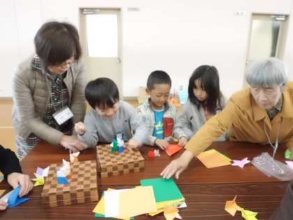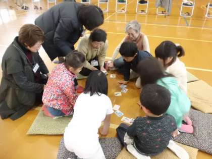 かるたでは,白熱した試合で盛り上がっていました。とんとん相撲は,折り紙でおすもうさんを作るところから教えていただきました。