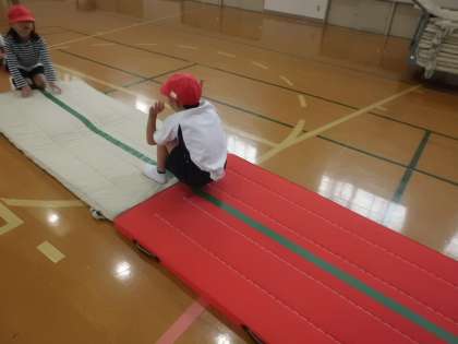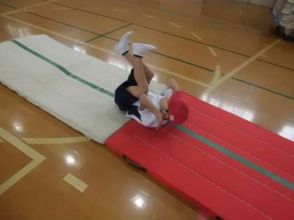 後転の練習をしました。両手を耳の横でしっかりとマットにつける練習をしてから回る練習をしました。どの子も一生懸命練習し,ずいぶんと上達し,回れるようになってきました。