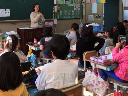 高学年に英語を教えに来てくださっているALTのペンボス先生が給食時間に来てくださいました。