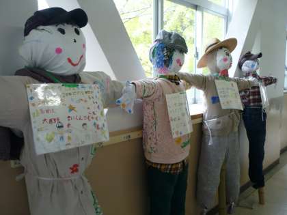 10月の31日に作ったかかしさん達がフェスタ大原野に展示していただくために,大原野中学校へお引っ越ししました。当日は,子ども達が作った名札を付けたかかしさん達が校門で出迎えてくれました。今度は,26日(土)の風土food大原野で展示していただく予定です。