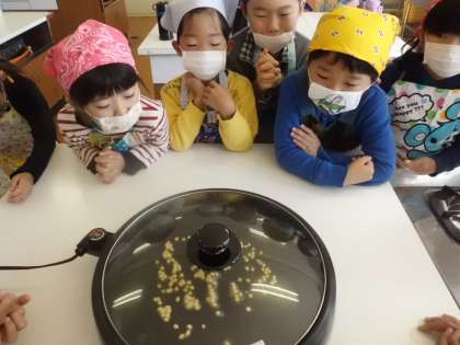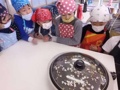 1・2年生でポップコーンパーティーをしました。ホットプレートにポップコーンのつぶを入れて,はじけるのを待ちました。手を合わせてうまくできてと祈るようにして見ていました。はじけると「できた。」「ここも。」「こっちも。」とうれしそうに見ていました。