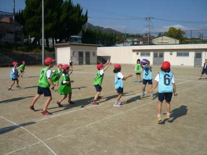 体育の学習で『パスゲーム』をしています。パスをつないで得点を入れるにはどうしたらよいか,それぞれのチームで作戦を立てながら進めています。「〇〇さ〜ん!」「パス,パス!!」と声を掛けながら活発にプレイする姿がとってもカッコイイ子ども達です。
