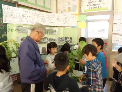 畑で作っておられる野菜も持って来ていただき,実際に触らせてももらい,とっても喜んでいました。