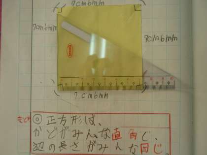 今日は,長方形からつくった四角形のかどの形や辺の長さをしらべました。『直角』という概念も少しずつ身につき,たくさんの子が4つのかどの形が直角になっていることや,正方形は辺の長さがみんな同じであることに気がついていました。