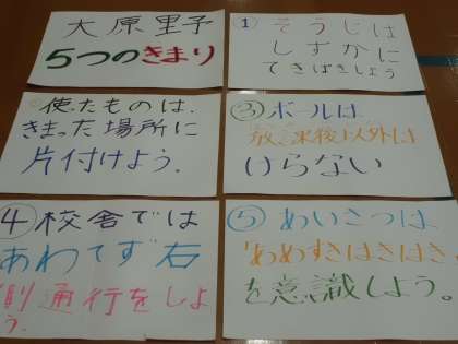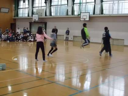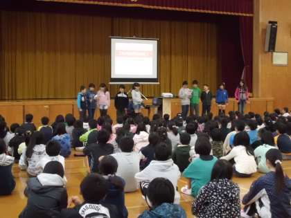 最初に,児童会本部委員から「大原野の5つのきまり」の確認と,今月の目標の発表がありました。次に放送委員会が自分達の仕事を紹介しました。最後に運動委員会から12月12日(月)中間休みにある「全校大縄大会」についてルールの説明がありました。運動委員のお兄さんお姉さんの華麗な「8の字跳び」に大拍手が起こりました。当日は低学年・中学年・高学年に分かれて競います。