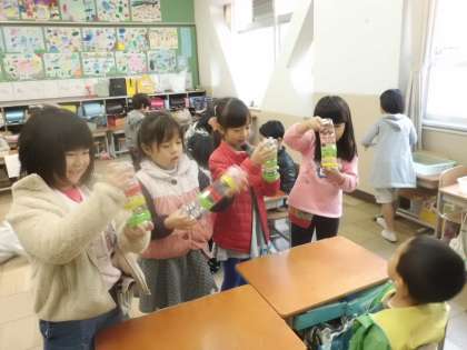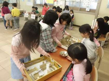 生活の秋みつけでみつけたどんぐりやまつぼっくりを使ったおもちゃができ上がり,遊びました。おもちゃを説明するお店屋さんと遊ぶ人にわかれて行いました。どのグループのおもちゃも楽しそうでした。写真は,どんぐり迷路・マラカス・どんぐり落としのおもちゃです。