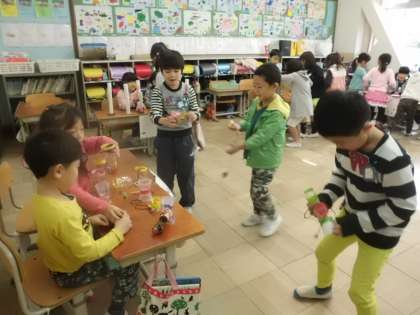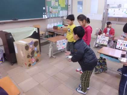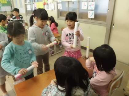 どのおもちゃも自分達で工夫して作っていました。それぞれどのおもちゃ屋にも回って遊び,楽しんでいました。写真は,どんぐりけん玉とまつぼっくりけん玉・まとあて・どんぐりおみくじです。