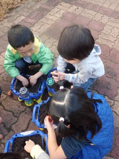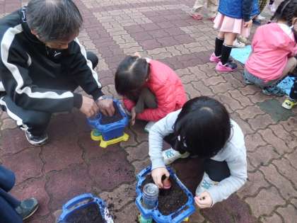 チューリップの球根は今まで育てたあさがおの種とは違うことを学び,植え方の説明を聞いた後に,自分の植木鉢に植えました。自分の鉢の土を出して,新しい土を入れ,球根が入る穴を開けて,そっと土をかぶせました。植え終わり,早く芽が出ないかなと待ち遠しそうでした。